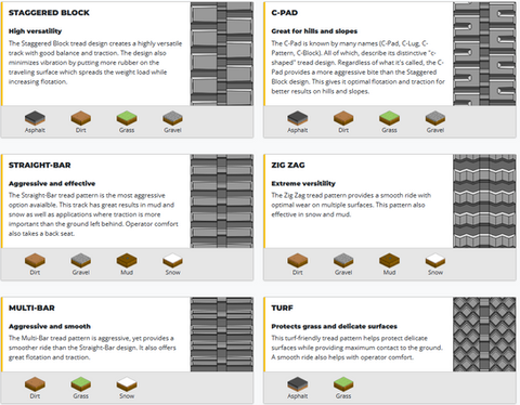 Our tracks are used on compact track loaders, mini excavators, directional drills, and crawler dumpers by ASV, Bobcat, Boxer, Case, Caterpillar, Ditch Witch, Gehl, IHI, JCB, John Deere, Hitachi, Komatsu, Kubota, Morooka, Mustang, New Holland, Nissan, Takeuchi, Terex, Toro Dingo, Volvo, Yanmar, and more.